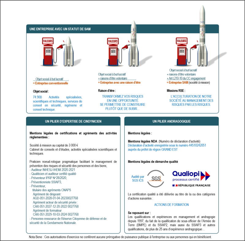 - Nous sommes une société à mission (SAM Article L210-10 du CC ) contributeur d’acculturation des sujets de maîtrise des risques et sécurité